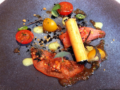 Amuse-bouche: salad of heritage (heirloom) tomatoes with fresh goat's cheese, dried olives, green tomato juice, herbs, and a dressing of tomato juice, shallots, balsamic vinegar and chives.