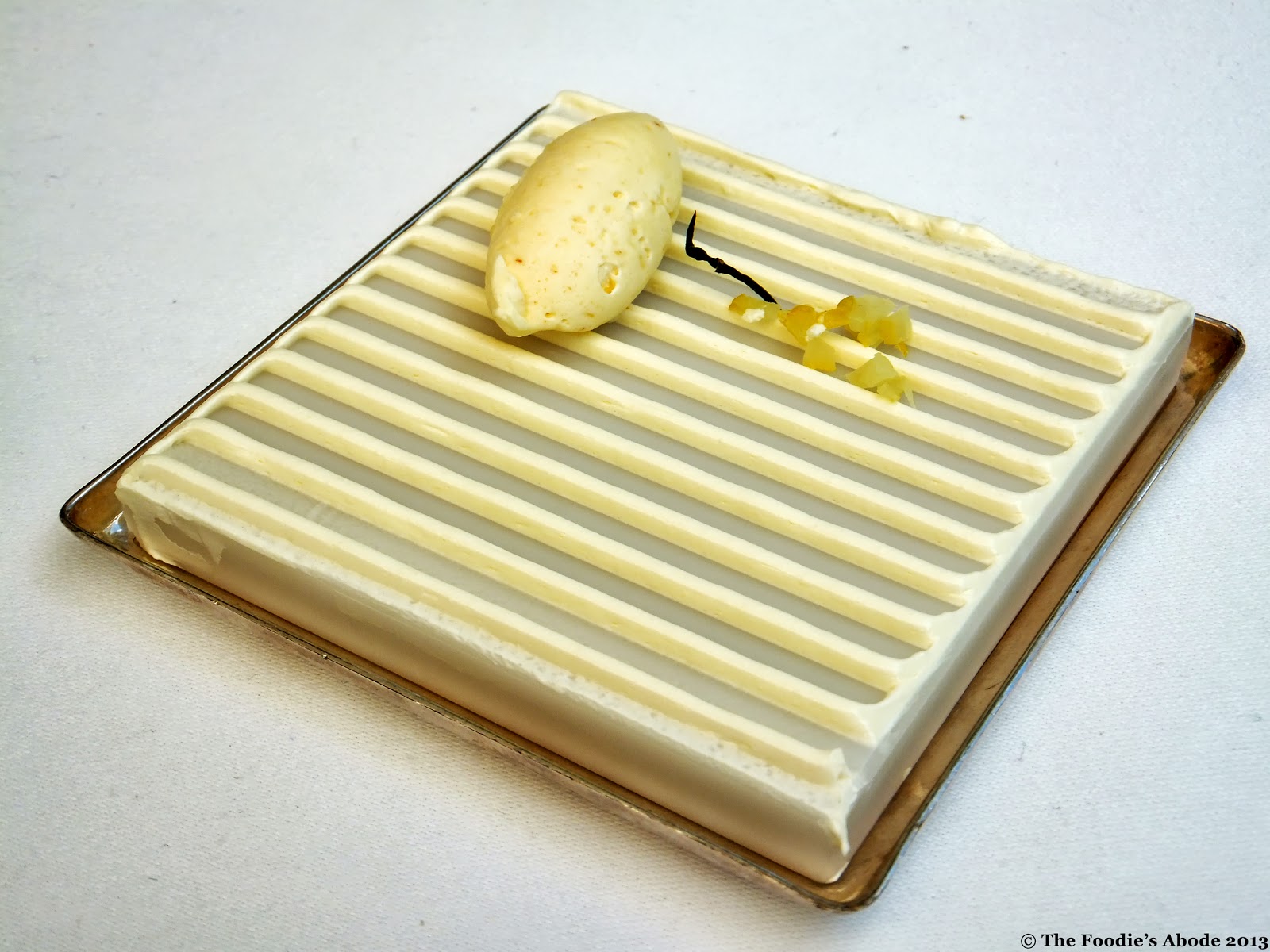 Shortly after this, a pretty-looking plate of sour cream butter with salted citrus fruit (lemon?) was presented, and the legendary fancy bread trolley with more types of bread than I can ever remember was pushed over to my table. I should mention that the bread waiter appeared very uninterested today as he rattled off hastily for the nth time his bread descriptions, without once establishing eye contact with me. I understand it all gets a bit repetitive and tiring, but still I could hardly believe that the same guy had served me a year ago with such enthusiasm. Nevertheless, being a forgiving customer, I shall concede that everyone is entitled to their off days.